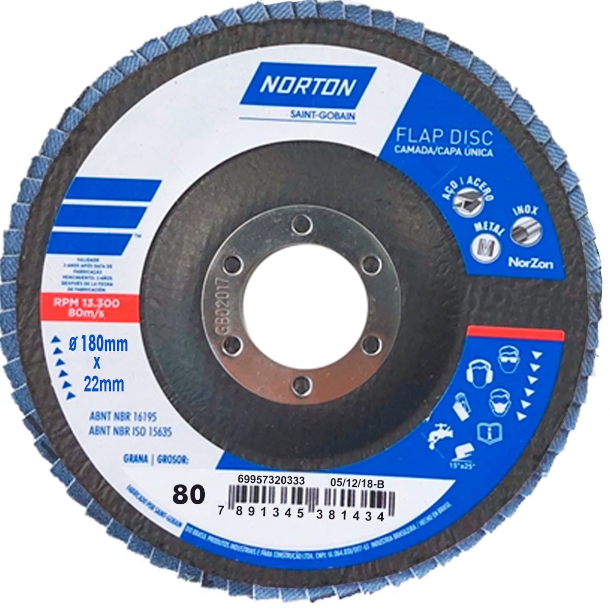 O Flap Disc Norton Original é um disco composto por uma camada de aletas de lixa com costado de tecido e grão Zircônio (Norzon – tecnologia Saint-Gobain que proporciona excelente poder de remoção), aplicados em suporte cônico de fibra de nylon.